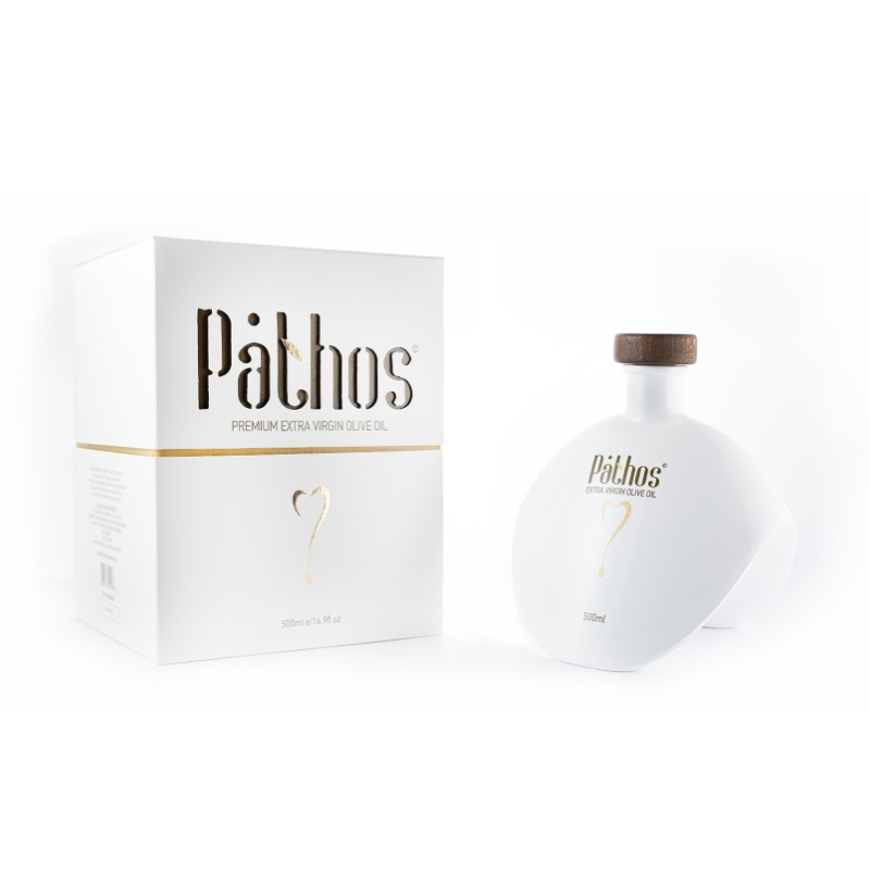 Extra panenský olivový olej Pathos je balen v bílých skleněných lahvích, které ho chrání před světlem, teplotou a vlhkostí. Díky luxusnímu kartonovému balení a originálnímu tvaru lahve je ideálním dárkem, který můžete darovat svým blízkým nebo komukoliv, kdo má rád kvalitní produkty.