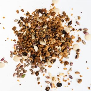 bezlepkové ovesné vločky*, mandlový krém*, pistácie* 13 %, kokosový sirup*, brusinky*, bílá čokoláda* 6 % (třtinový cukr*, kakaové máslo*, sušené mléko*, emulgátor: sojový lecitin*, vanilkový extrakt*, vanilka*), přepuštěné máslo ghí*, lněná semínka*, chia semínka* *ekologicky pěstované