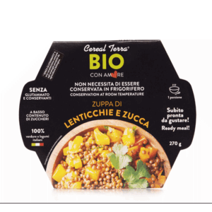 zeleninový vývar* (voda, sušená zelenina* v různých poměrech: mrkev*, řapíkatý celer*, cibule*, pórek*, rajče*, celer*), čočka* 24 %, dýně* 13 %, cibule*, mrkev*, extra panenský olivový olej*, mořská sůl, celer*, dvojitý rajčatový koncentrát*, petržel*, černý pepř* *ekologicky pěstované Může obsahovat ořechy, sóju, hořčici, sezam a obiloviny obsahující lepek.