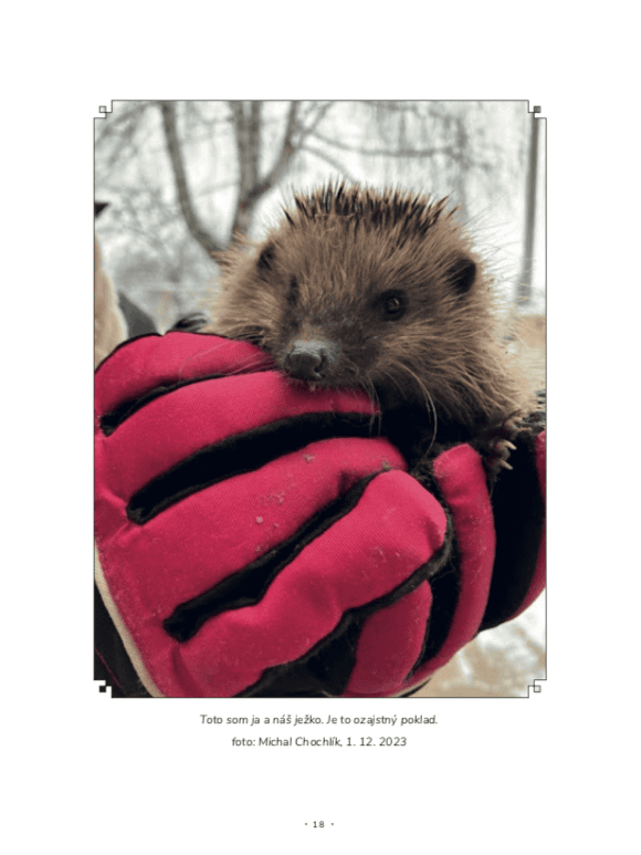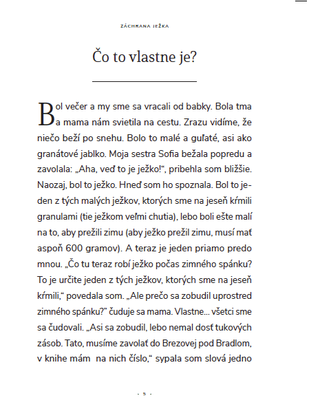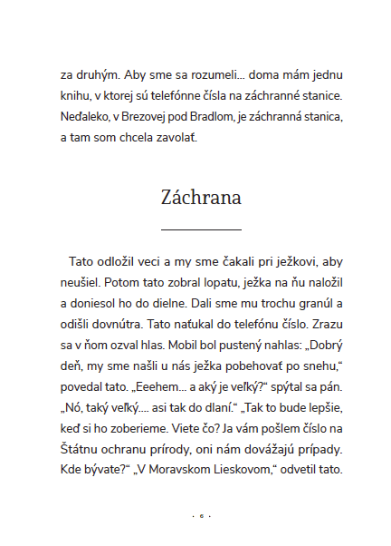 Kniha Záchrana ježka přináší příběhy o malých i velkých dobrodružstvích, která zažívá 11letá Laura s milovanými zvířaty, zejména s ježkem, kterého se rozhodla zachránit. Mladá autorka žijící v blízkém kontaktu s přírodou nám nabízí autentické a citlivé příběhy o péči, odpovědnosti a lásce ke zvířatům.