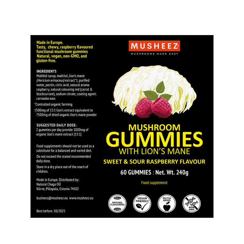 Estonská společnost Natural Chaga OÜ, působící pod značkou MUSHEEZ, se specializuje na výrobu certifikovaných organických extraktů z funkčních hub, jako je čaga, reishi nebo hericium.