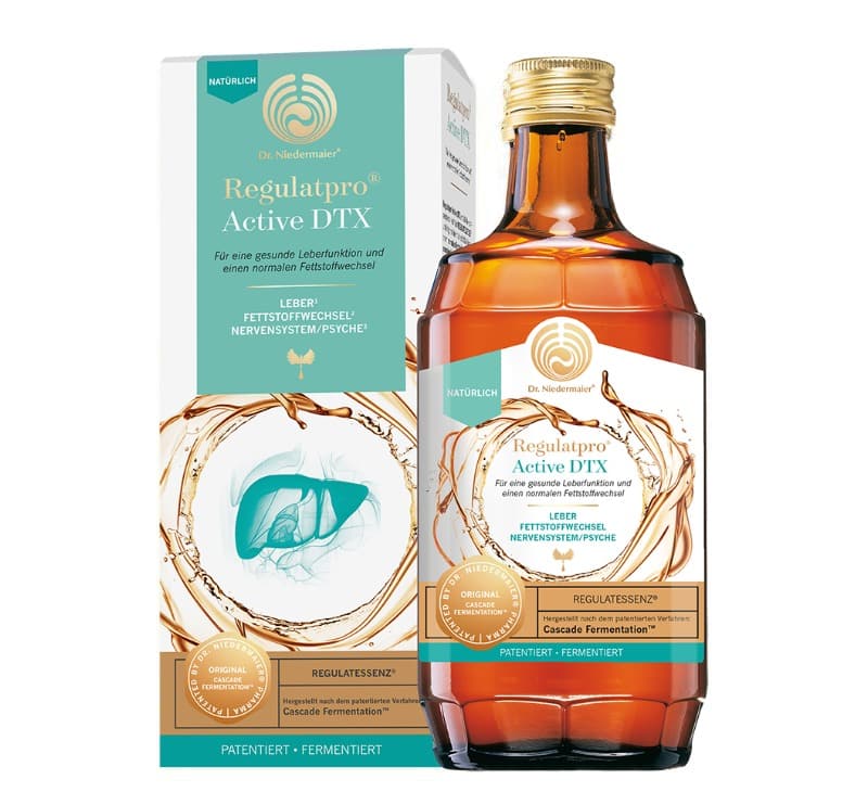 Regulatpro® Active DTX je tekutý enzymový doplněk stravy vyrobený kaskádovou fermentací z bio ovoce, zeleniny, ořechů a bylin. Obsahuje 85 % kaskádově fermentovaného koncentrátu REGULATESSENZ® a je obohacen o selen, zinek, dimethylsulfon (MSM), cholin a vitamíny (B1, B2, B3, B5, B6, B12, C a D3), které podporují zdravou funkci jater a metabolismus lipidů, udržují rovnováhu střevní sliznice, stabilizují nervový systém a dodávají tělu novou energii1.