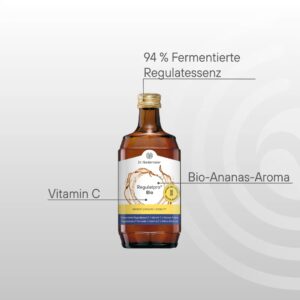 Hlavní složkou tekutého enzymového doplňku stravy Regulatpro® Bio s ananasovou příchutí zůstává vícenásobně fermentovaná esence REGULATESSENZ®. Je obohacena o přírodní vitamín C z třešně aceroly1, který podporuje imunitní systém, přispívá ke zdravému energetickému metabolismu a pomáhá snižovat únavu a vyčerpání.