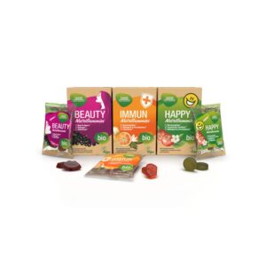 Vitamínové gumové bonbóny – Happy (Bio) jsou doplněk stravy s 5-HTP a vitamínem B12 z rostlinných extraktů pro podporu duševní pohody.