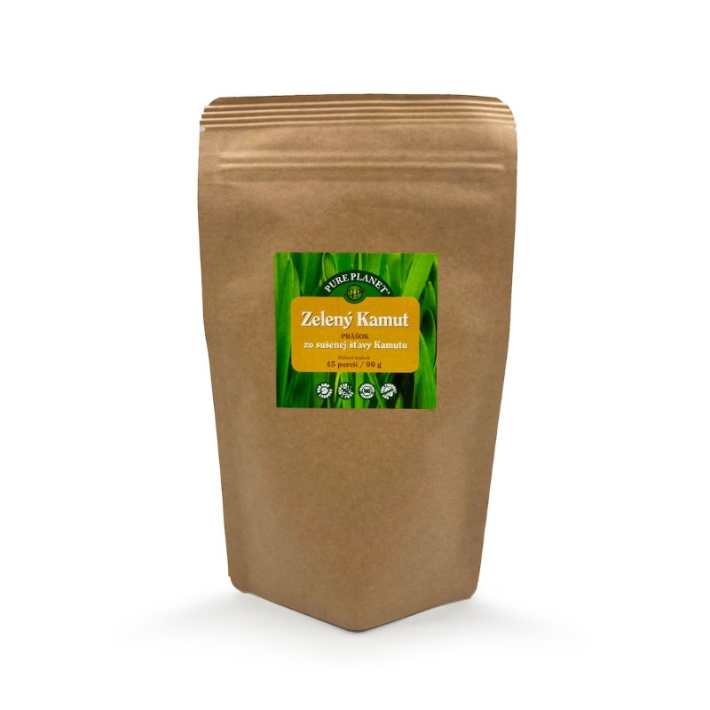Zelený kamut je 100 % čistý, certifikovaný BIO prášek špičkové kvality ze šťávy z pšenice Kamut. Konzumuje se smíchaný s vodou nebo ovocnou šťávou. Čistí a detoxikuje, podporuje regeneraci buněk, zdravý imunitní systém, zvyšuje energii, snižuje pocit únavy, zajišťuje zásadité živiny a tím podporuje zdravou hladinu pH v těle a poskytuje živiny obsažené v listové zelenině.